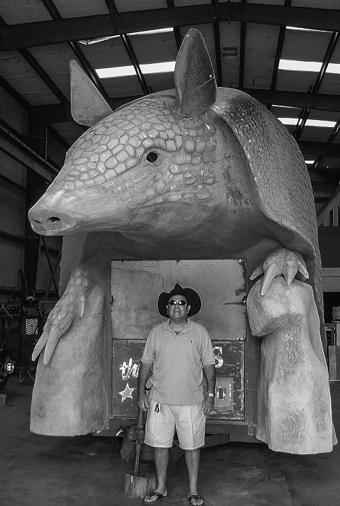 The armadillo was originally hauled in two pieces on two connected trailers—the body on one; the tail on the another, wagging back and forth as it rolled down the interstate.
